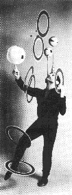 While he acknowledges that his own road to artistic satisfaction passes through a phase of numbers juggling, today he looks at juggling as athletic endeavor with disinterest. "In the beginning my idea was to juggle eight rings because I knew Rastelli juggled eight plates. I was in the Guinness book for two years when I was a kid and I was proud of that. But there weren't so many jugglers then. Where will it all end? I don't think we've reached the limit in numbers yet, but I don't think much about numbers any more.