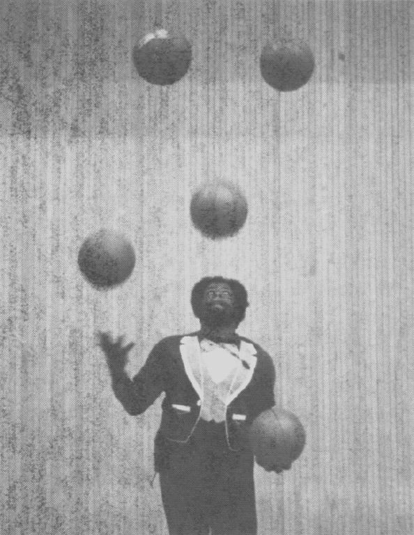 In 1983, at 24 years old and juggling less than a year, this ghetto kid entered the Juniors competition at the IJA convention in Purchase, N.Y. From street directly to stage he went. Five clubs and seven balls he gave them. He stood splay-footed on a basketball, juggled three machetes and balanced a basketball on a cylinder on his head at the same time. Then, with the rudimentary beginnings of what was to become his trademark, he tossed up three 16-pound lead shotputs into the air (that's 48 -- feel 'em -- 48 pounds!) and juggled them for ten throws.
