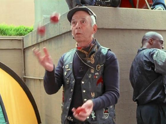 juggling 3 balls while dressed in biker gear. He is asked, "As a retired