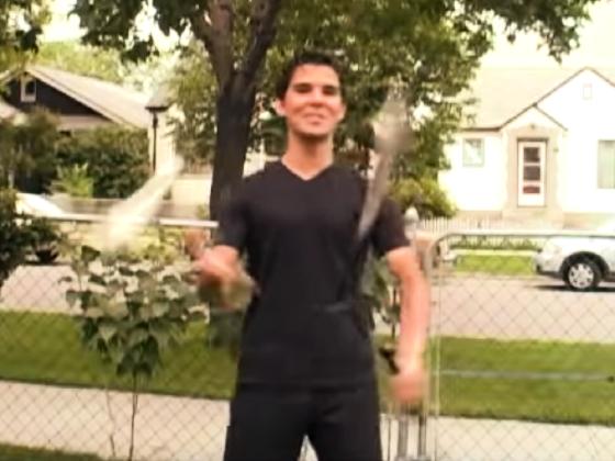 juggles 3 machetes,