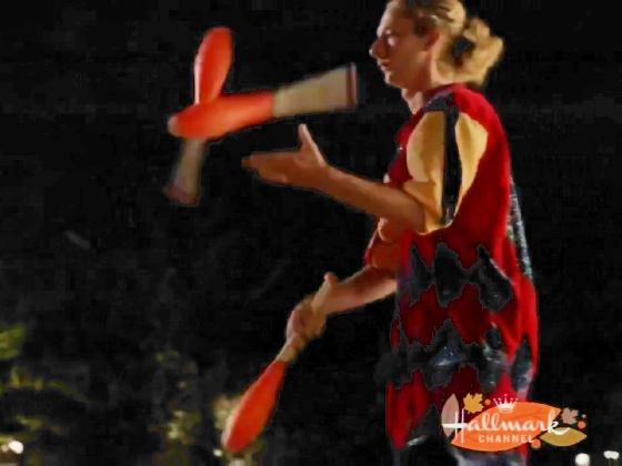 At 1:06:36, we see a stilt walker juggling 3 orange clubs for 11 seconds.