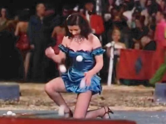 At 2:31:15, Miss Loni does foot juggling outdoors, seen twice in half