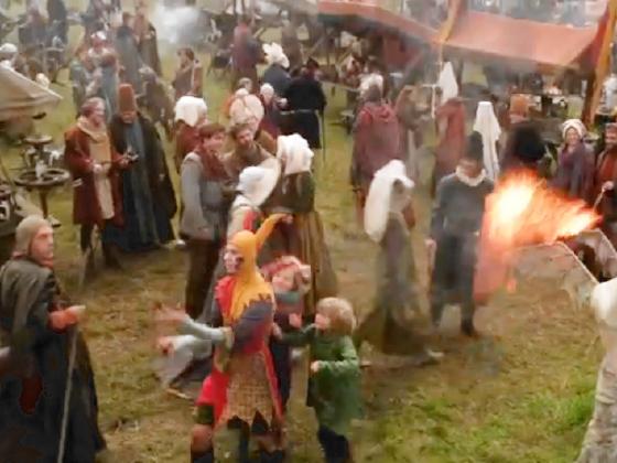 At 58:01, Matthew Hodgkin wears a jester costume to play the King's