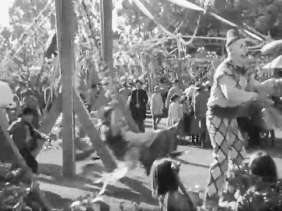 At 1:12:58, playing a clown at an outdoor festival, Ed Goddard juggles