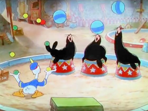 Animation. Mickey is ringmaster of a circus for orphans. Donald has a trained sea lion act, and does a bit of juggling himself. Mostly, though, he fights with a baby sea lion who keeps stealing both the fish and the show. Donald then finds himself and Mickey in an unrehearsed high wire act, which kicks into high gear when one of the orphans electrifies the wire. They end by doing a high dive into the seals' tank.