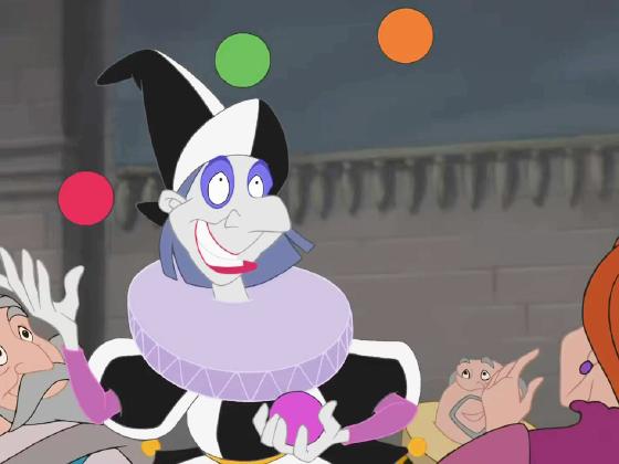 At 46:34, a jester juggles 4 colored balls briefly before tossing them