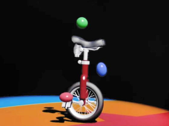 At 01:04, a clown on a unicycle juggles three balls for a minute.