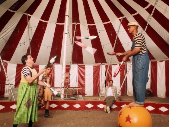 At 12:28, two clowns, one standing on a rolling globe,
