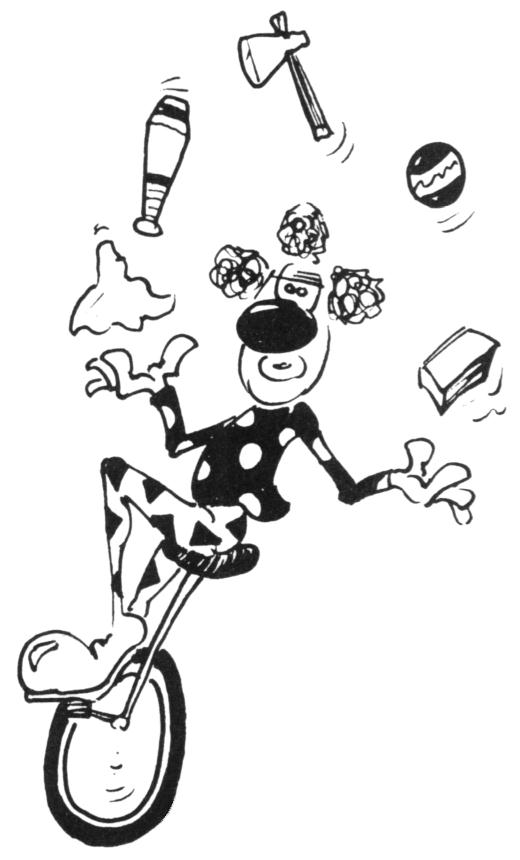 Drawing of a clown on a unicycle juggling 5 varied objects.